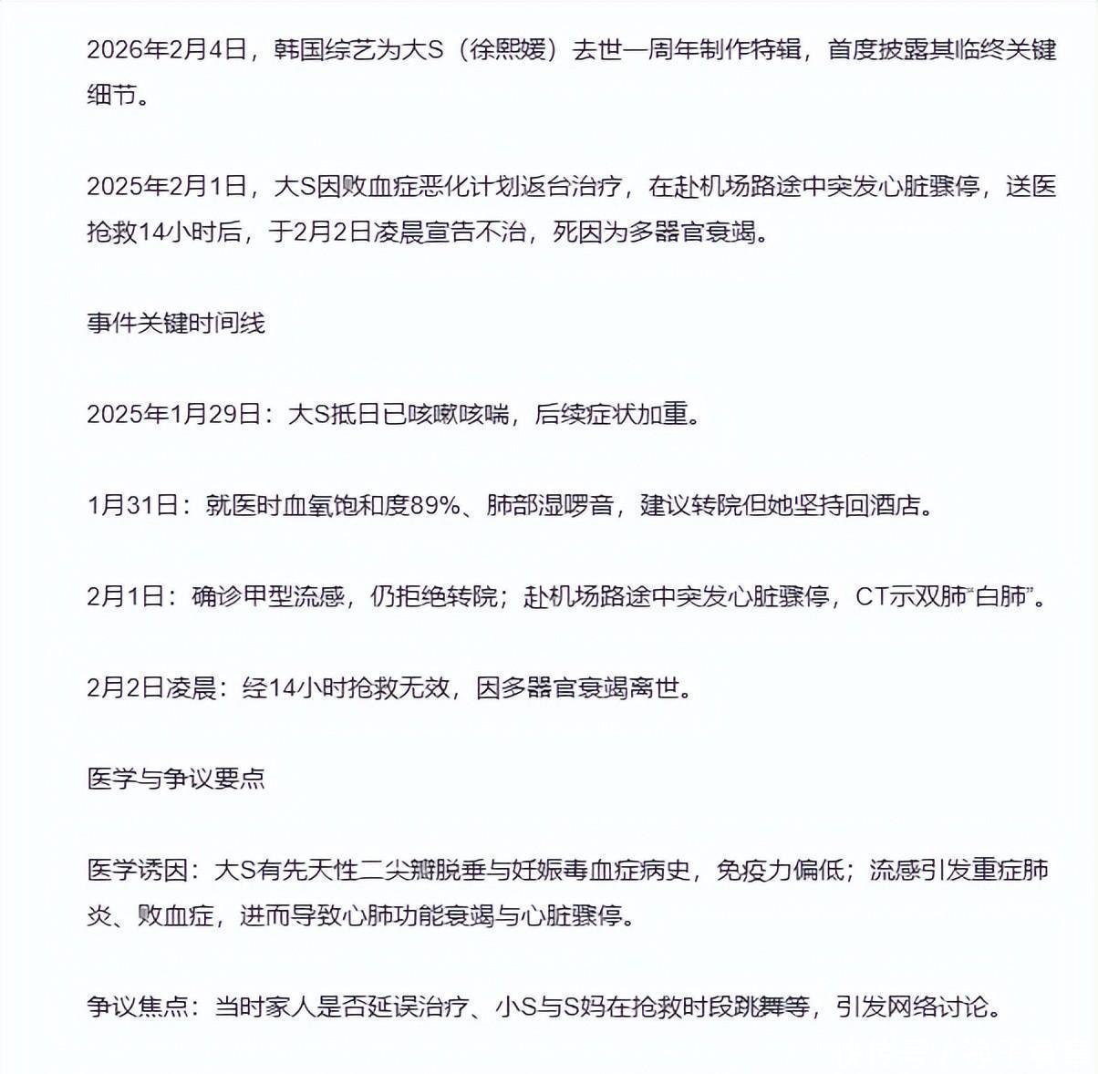 大S离世快一年了,围绕她的讨论却一点没停。最近韩国一档叫《名人生老病死的秘密》的节目,把大家的目光又拉回了那个揪心的时刻。原来,她那次去日本,身体早就亮起了红灯。