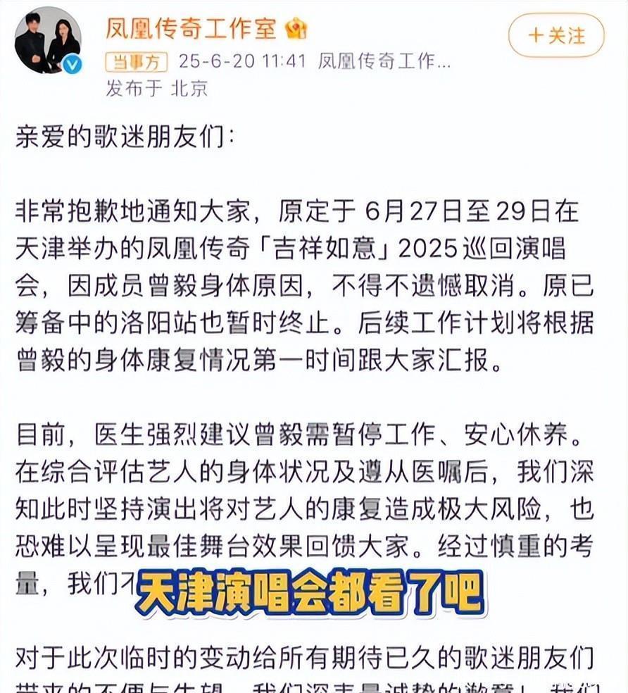 这场风波的影响远比想象中大得多,6月20日,凤凰传奇工作室发出公告,说是因为“曾毅身体原因”,取消了原定在6月27日至29日期间的天津演出。